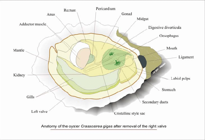 Oysters are bivalve mollusks, meaning that they have flat bodies and a shell containing two hinged parts. These two shells are held tightly together when the oyster is shut by an adductor muscle that is attached to both the top and the bottom. An oyster has basic organs like a mouth, heart, stomach, anus, and reproductive glands, but no head. They lack a central nervous system, which we suspect means that they cannot feel pain.