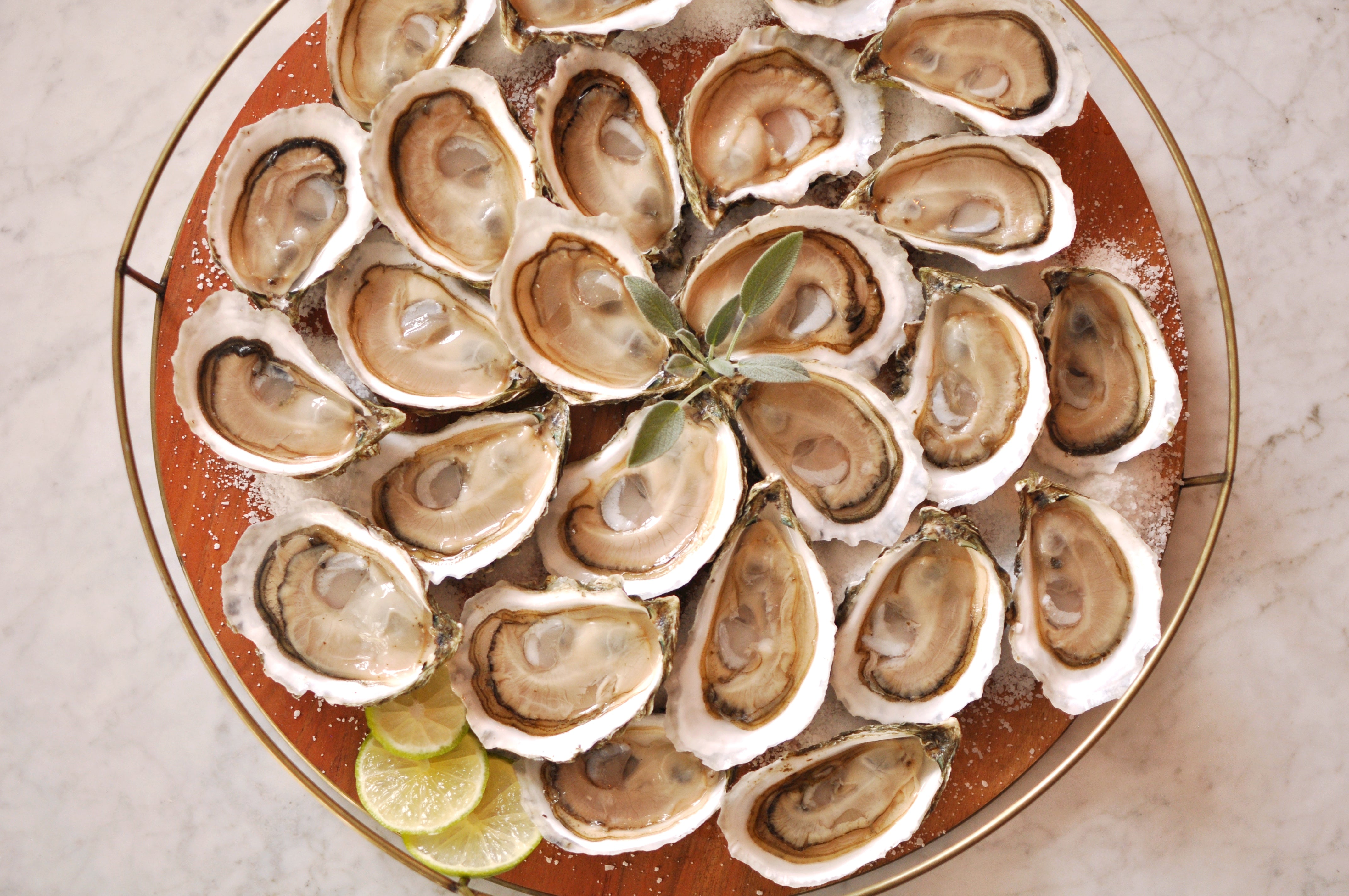 I love using a wooden base with salt to plate oysters for visual appeal. An easy way to build a tray is to spin your oysters out from the center. This offers both design and support in keeping your oysters horizontal, especially if you aren’t plating with ice.